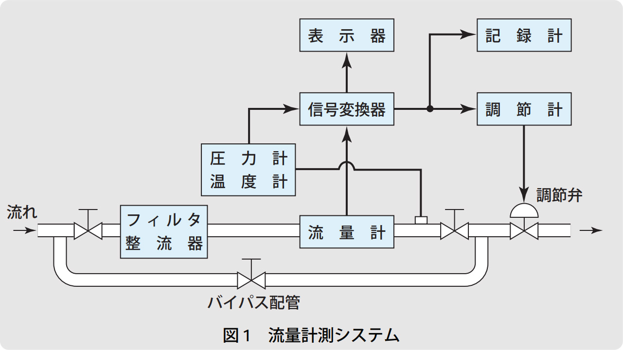 流れを測るには、流量計本体のほかに、図1に示すような流量計を含むシステム全体を検討する必要があります(図には最大限の構成要素を示しました。流量計の種類によって、この中のいくつかが必要になります)。高価な流量計を買っても、必ずしも高精度の測定ができるわけではありません。表示器、積算器など関連するハードウェアだけではなく、用途別にどのような流量計を選ぶか、精度をどうやって保証するかなどのソフトウェア技術も重要なのです。
