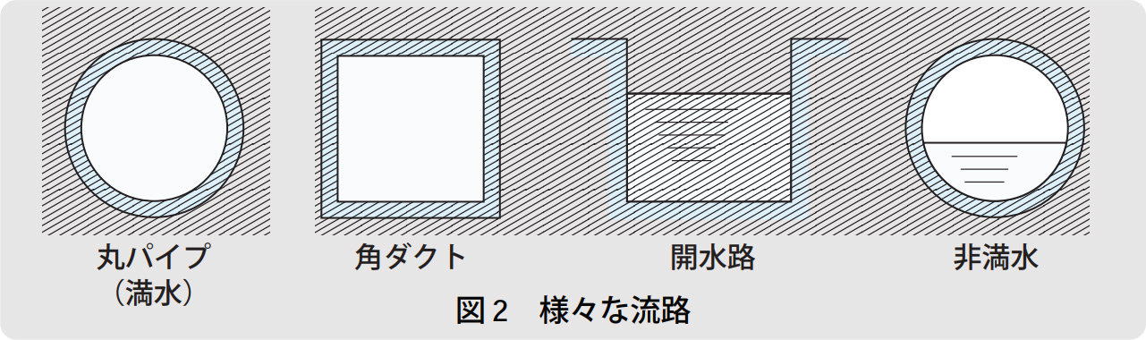 また、測定対象が流れる流路の断面状態も図2に示すように様々です。一般的な丸パイプのほかに、角ダクトがありますし、天井のない開水路もあります。下水道は円形断面ですが、通常は非満水状態です。