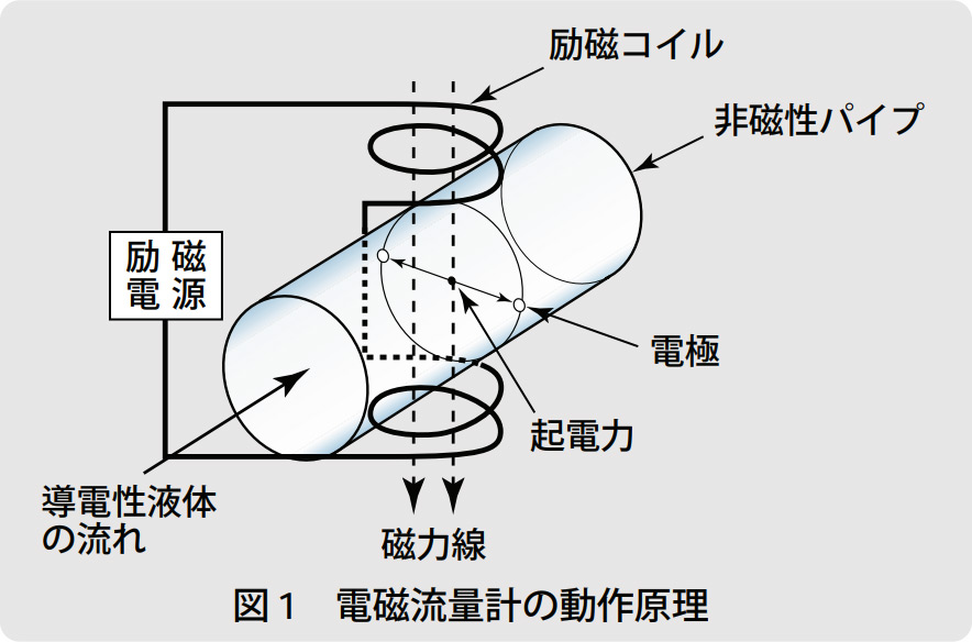 図1に示すように、磁界の中を導電性液体が流れると、流れと直角の方向に、流速に比例した起電力を生じます。原理としては発電機と同じです。流量計の管体パイプは非磁性のステンレス鋼で作るのが一般的ですが、起電力がショートして消えないよう、電極をパイプから絶縁し、さらにパイプの内側も絶縁性物質で内張りします。