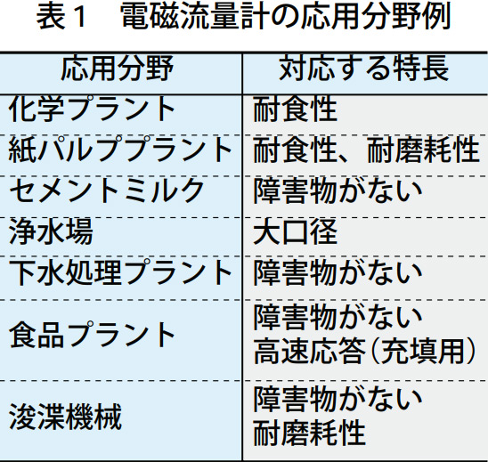 電磁流量計が高価であった時代は、その特長が最も発揮できる分野(表1参照)に応用が限られていました。しかし、価格が下がるにつれて用途が広がり、最近では中口径の水道メータにさえ使われるようになりました。
