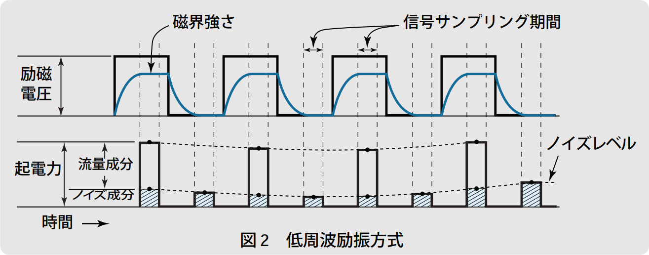 この問題を抜本的に解決したのが低周波励振方式です。これは図2に示すように、直流で断続的に磁界を作り、磁界があるときの信号からないときの信号を差し引きます。磁界がないときの信号はノイズですから、差し引き後の信号にはノイズ成分が消え、流量成分だけが残る仕組みです。