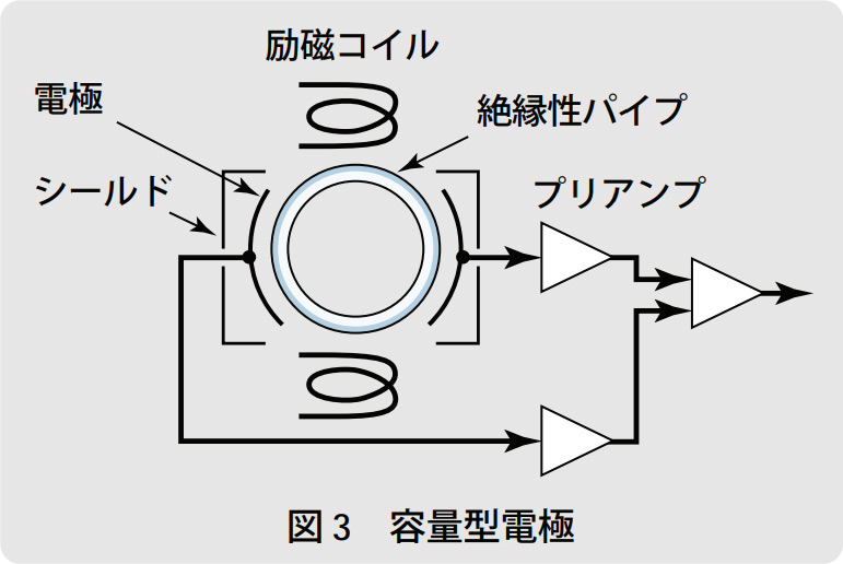 もう一つの制約条件である導電性の問題は、容量型電極の開発により改善されました。これは、図3に示すように絶縁性パイプ(通常はセラミック)の外側に電極を配置し、静電容量を介して起電力を取り出す仕組みです。詳細な説明は省きますが、このようにすると従来数 μS / cm であった導電率の下限値を、さらに数十分の一まで下げることができます。この結果、アルコールや脱イオン水など導電性の低い液体が測れるようになりました。ただし、油や超純水のように導電性がまったくないものは、現在も測れません。