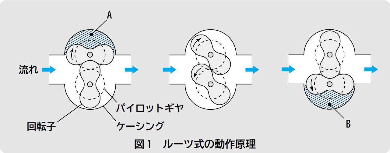 計量室の作り方にはいろいろあり、それに対応して容積式流量計の構造もロータリーベーン式、往復動ピストン式、膜式など多様に分かれています。ここでは、構造が簡単で動作が分かりやすいルーツ式について説明しましょう。