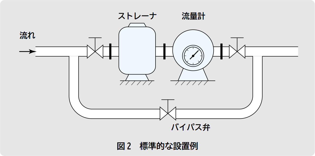 したがって、通常は上流側に異物除去用のストレーナを設置します。ストレーナの点検・洗浄の際には流れを止める必要があり、流れを止められない場合はバイパス配管を設置します。図2に標準的な設置例を示します。