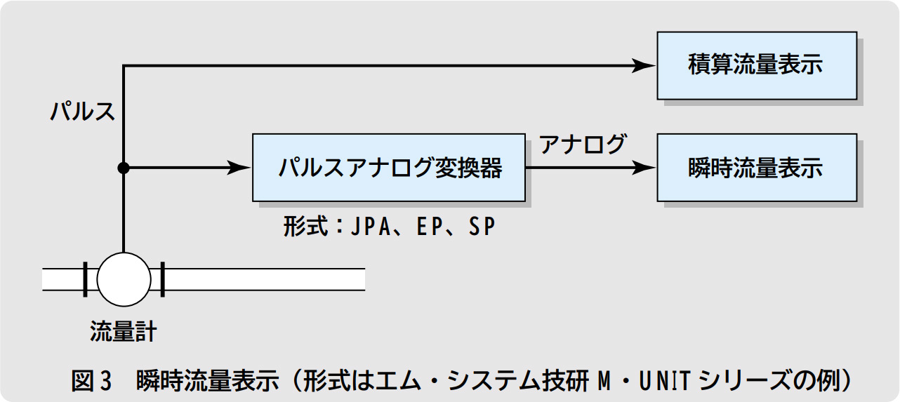 容積式流量計の出力信号は基本的にパルスなので、瞬時流量を知りたい場合は、図3に示すように信号変換器でパルス信号をアナログ信号に変換します。