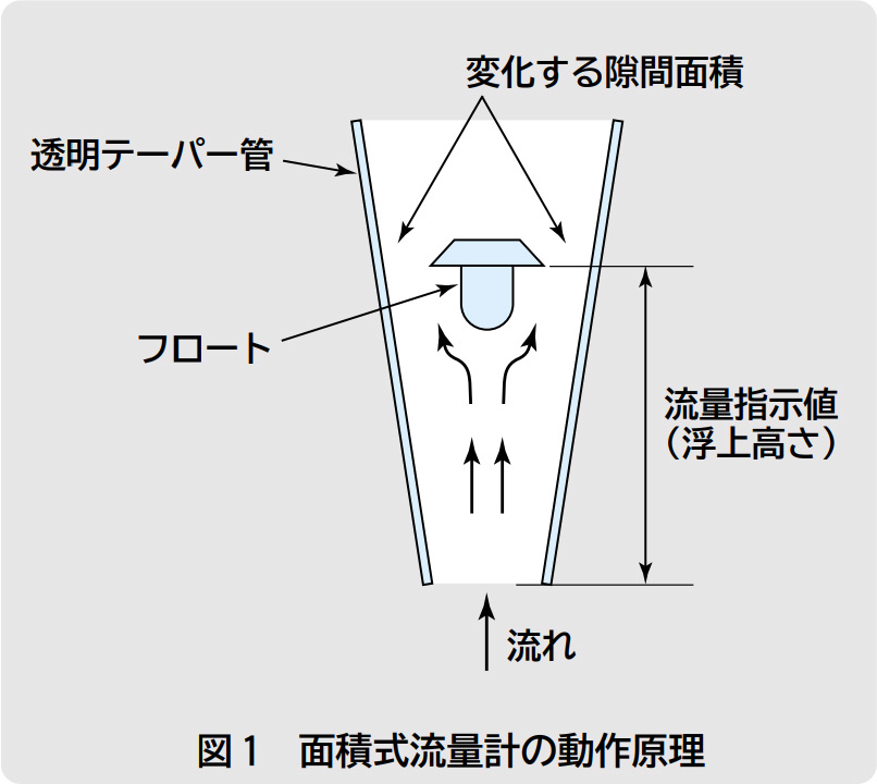 面積式流量計の動作原理は、単純明快です。図1に示すように、下から上に向かって広がった透明なテーパー管の中にフロートがあり、このフロートは流れに押されて上方に動きます。フロートが上がるにつれて、テーパー管の内壁とフロートの間から流体が抜け出る量が増え、フロートを押し上げる力が弱くなります。最後にフロートはその押上げ力と重さがバランスした位置で止まり、この位置が流量を表します。フロート自体が指針の役割を果たすため、ほかに余分な表示機構は要りません。