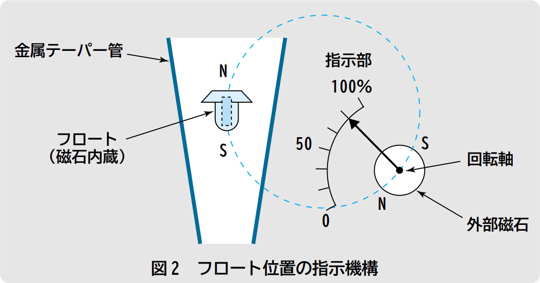 高温・高圧流体や腐食性をもつ流体など、ガラス管では耐えられない場合にはテーパー管を金属で作りますが、困ったことに内部が見えません。そこで、フロートの位置を外部に知らせる仕組みが必要になります。仕組みとして一般的なのは、フロートに内蔵した磁石で外部の磁石を回転させる方式です。具体的なメカニズムについては、図2をご覧ください。磁石を利用する以上、テーパー管は当然非磁性でなければならず、金属ならばすべて使えるわけではありません。