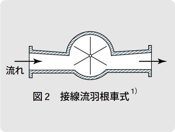 流体で羽根車を回す方式には、流れを羽根車の回転面と直角に当てる軸流式(図1)と、回転面と平行に当てる接線流式(図2)の2種類があります。羽根車の回転回数が体積流量に、回転速度が瞬時流量に比例します。