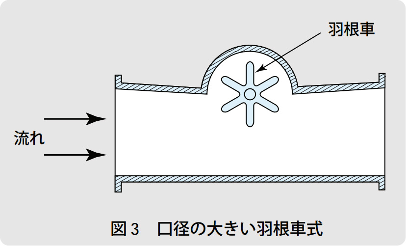 接線流式は容積式に似ていますが、容積式は回転子と流路の壁との隙間を極力狭め、漏れを最小に抑えています。一方、羽根車式は漏れを問題にせず、口径が大きくなると図3に示すように、流れの一部で羽根車を回します。