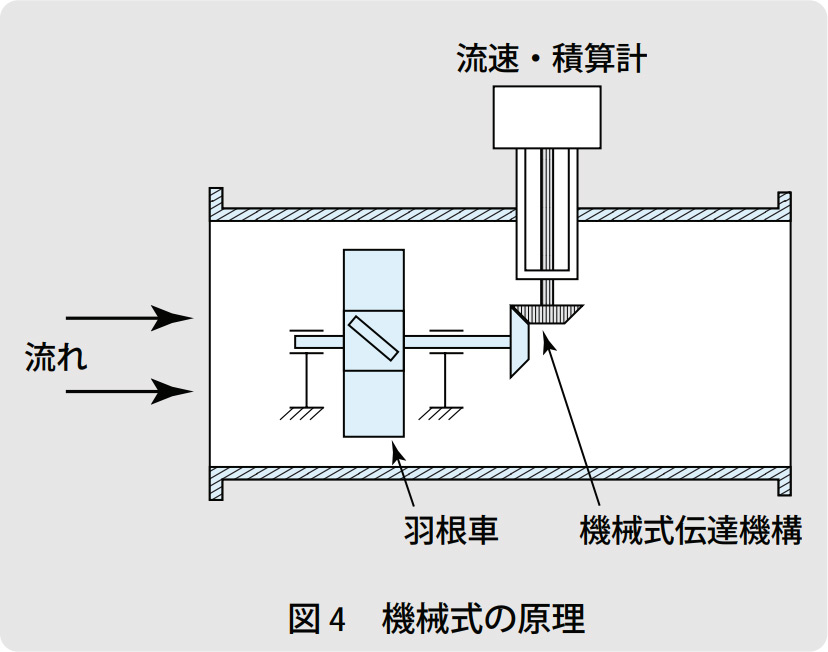 羽根車の動きを外部に取り出す機構には、機械式、光式、磁気式があります。機械式は、図4に示すように羽根車の動きを機械的伝達機構で外部に取り出し、積算計を駆動するもので、大型の水道メータなどに用いられています。