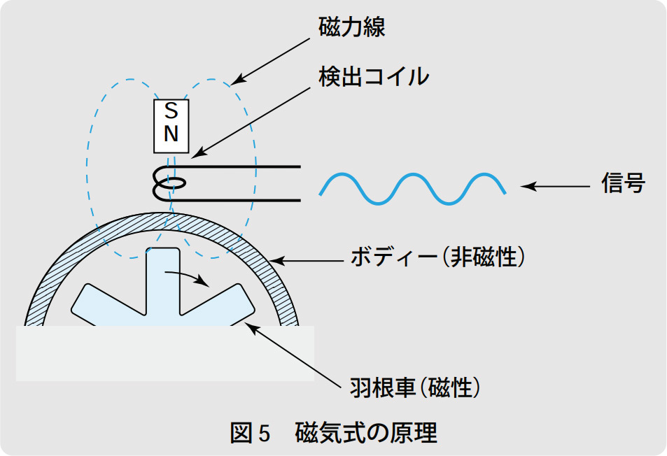 光式は流体と流路が透明な場合に適用可能ですが、より一般的には、図5にその原理を示す磁気式が使われます。磁石、検出コイル、磁性材質の羽根車、非磁性材質のボディーから構成され、羽根が検出コイルの前を通るたびに、磁束変化により検出コイルにパルス電圧信号を発生させます。羽根車が非磁性の場合は、羽根の先端に小さな磁石を埋め込みます。
